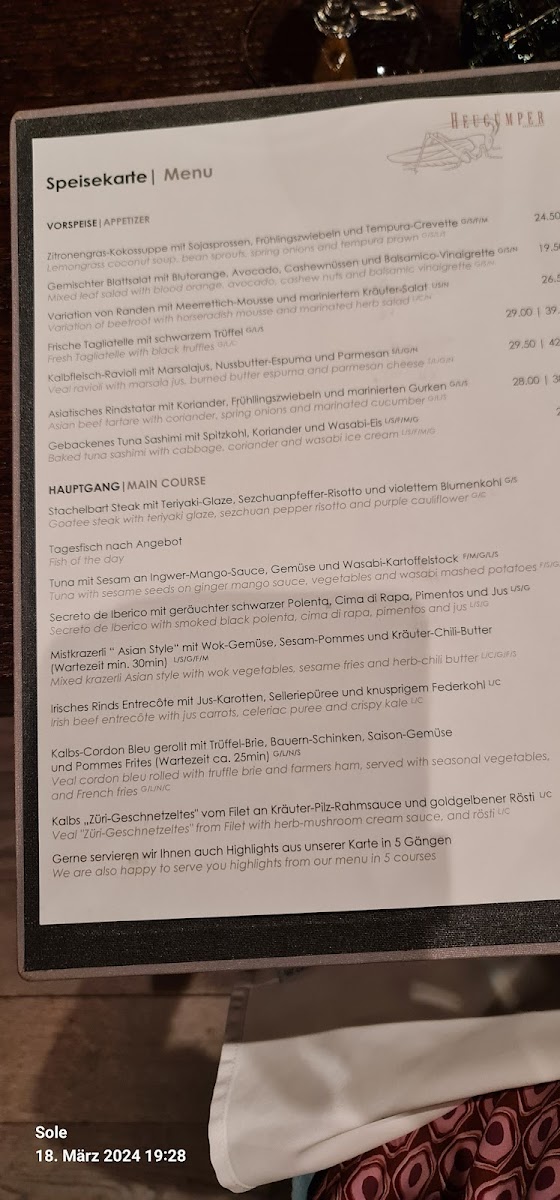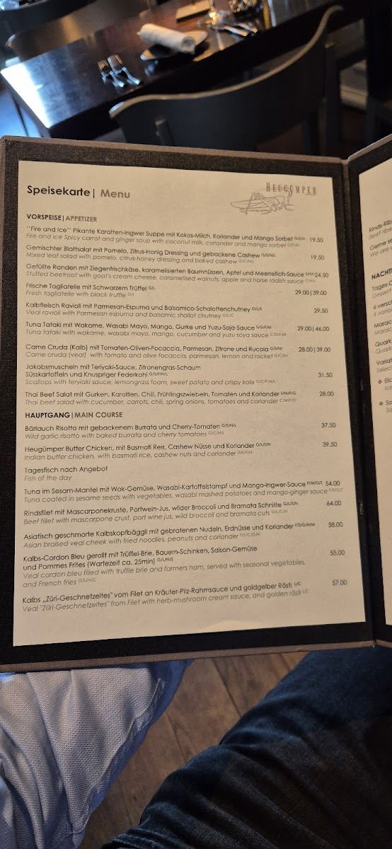 Welcome to Heugumper, a standout fusion restaurant nestled in the heart of Zurich at Waaggasse 4. Here, culinary artistry meets exquisite flavor, setting a new standard for dining experiences. The menu showcases a delightful blend of classic Swiss and innovative global dishes, perfect for any discerning palate. Highlights include the rolled KalbsCordon Bleu with truffle Brie, served alongside seasonal vegetables and crispy fries, and the tuna infused with sesame, elegantly paired with ginger mango sauce and wasabi potato mash. Each plate is a testament to meticulous preparation and artistic presentation.